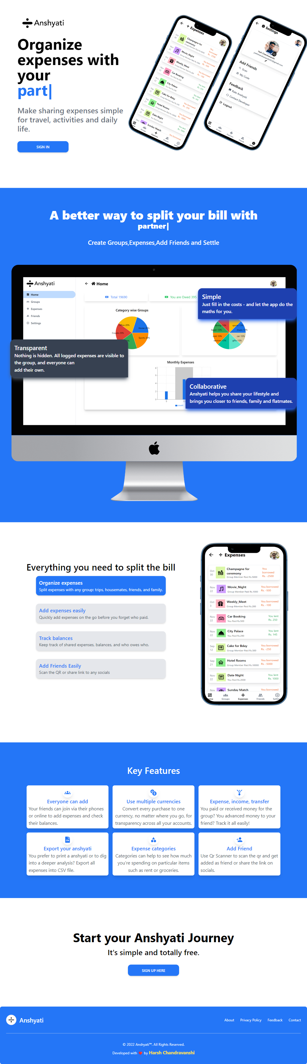 The app named ANSHYATI to split the bills and pay the share instantly after an eat-out or any other event. In this app users can create groups,add expense,can view who owes who and settle up. It also provides graphical representation of category wise expenses,category wise groups and monthly expenses of users.One can create group,to join the group created by other one can simply follow up the link shared by person who created the group.Expenses can be splitted only to selected members which is part of the group.One can also add friend using QR code. Apart from functionality it also provides great UI which gives users a great experience.